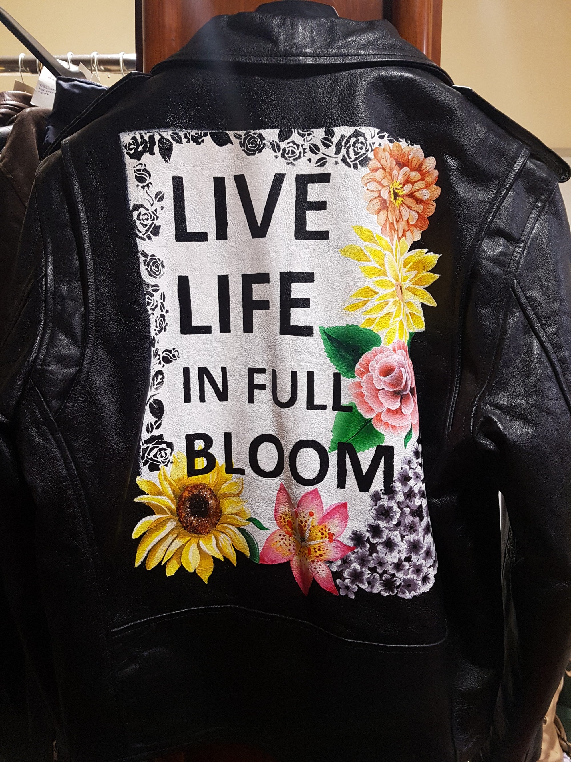 Beautifully hand painted with "Live life in full bloom" the colours on the flowers stand out so well on the white background and contrast of the dark black jacket. On the front it has a YKK zip that leads up to a double breasted front, zipped pockets at the waist and a belt for a tapered fit.