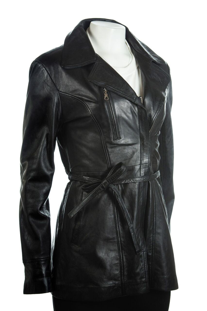A fashionable extension of the classic biker style jacket made from genuine soft sheep leather. It features panelling to contour the body and create a fit and flare shape, alongside a diagonal zip and removable leather belt for extra flair. With multiple pockets for whatever you carry, this jacket is both practical and extremely stylish and versatile throughout the year.