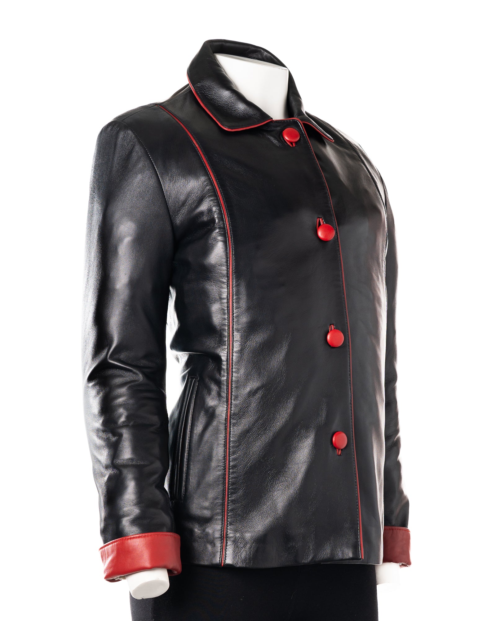 This is a stylish semi-fitted button up ladies jacket in a strikinG super soft sheep napa. Attention to detail is paramount in this design. The four central buttons are covered in black leather, you will aslo find the contrasting black colour feature in the turn up cuffs and in between the front panels. A shirt style collar and hidden slanted pockets at the waist complete the beautiful design. Sitting just below the hips this jacket is both eye-catching and practical.