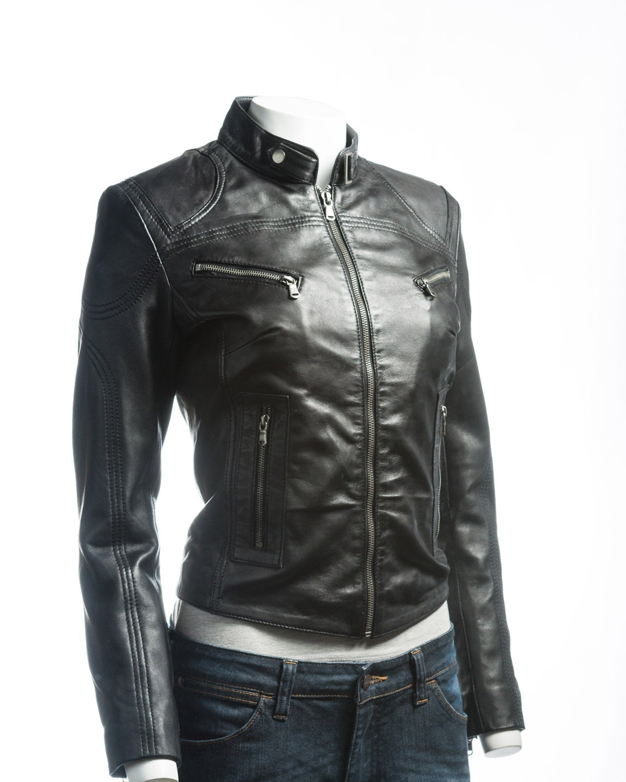 A super slim fitting biker style jacket fashioned from super supple sheep napa. The jackets features a durable YKK zip rising to a small stand up press stud fastening collar. Angled zipped pockets are at the chest and waist, cuffs are also zip adjustable. Paneling detail at the shoulders and the slight fishtail sit perfectly on the lower back curve. This design offers a unique, flattering and figure hugging silhouette. Beautifully lined with satin, a super stylish addition to any wardrobe.
