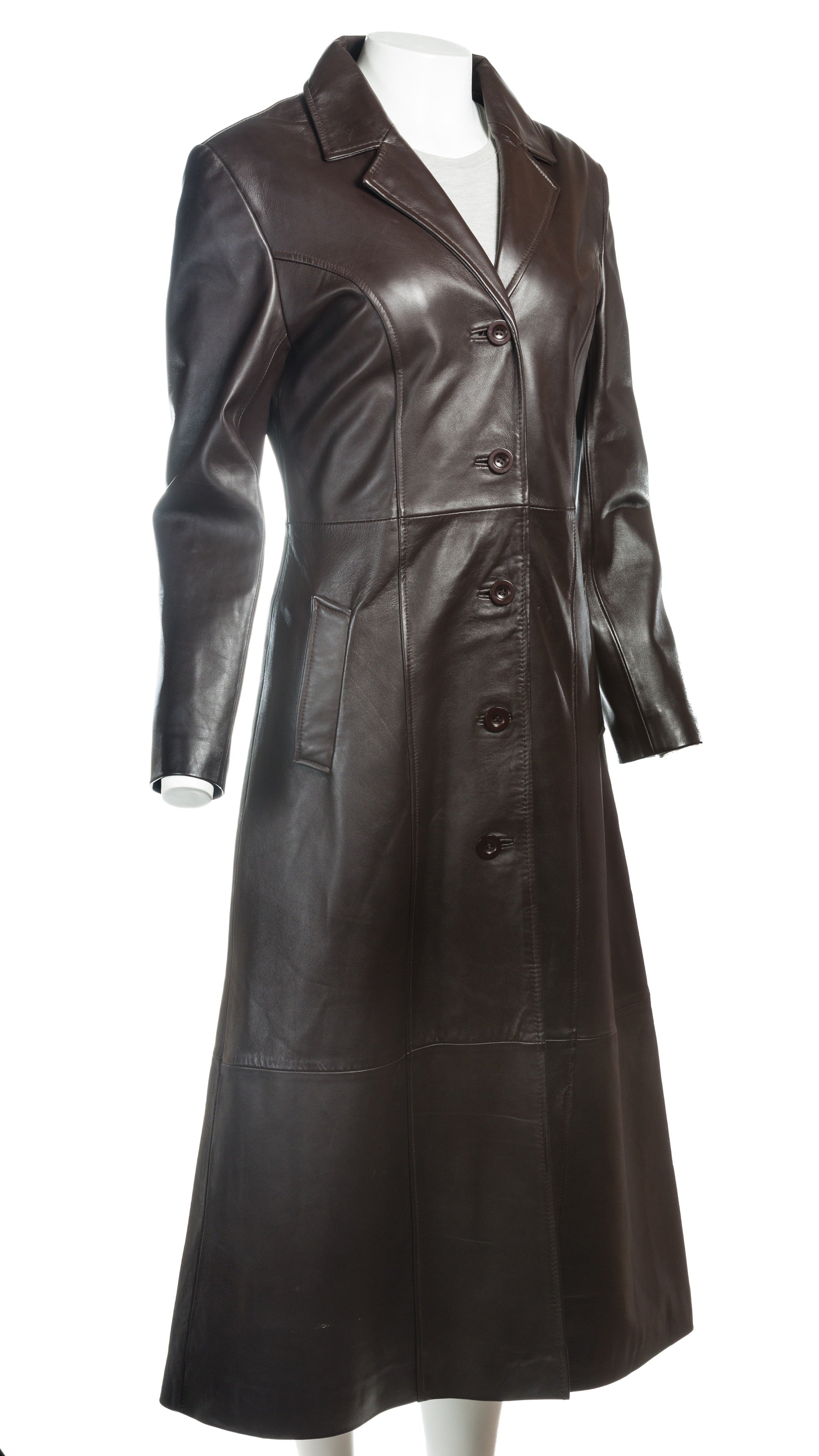 This is the classic full length length, button-up, leather coat with revere style collar, crafted from soft and smooth sheep nappa. There are hand warmer pockets at the hips and a further two pockets inside, for extra security. Simple, sleek and timeless elegance.