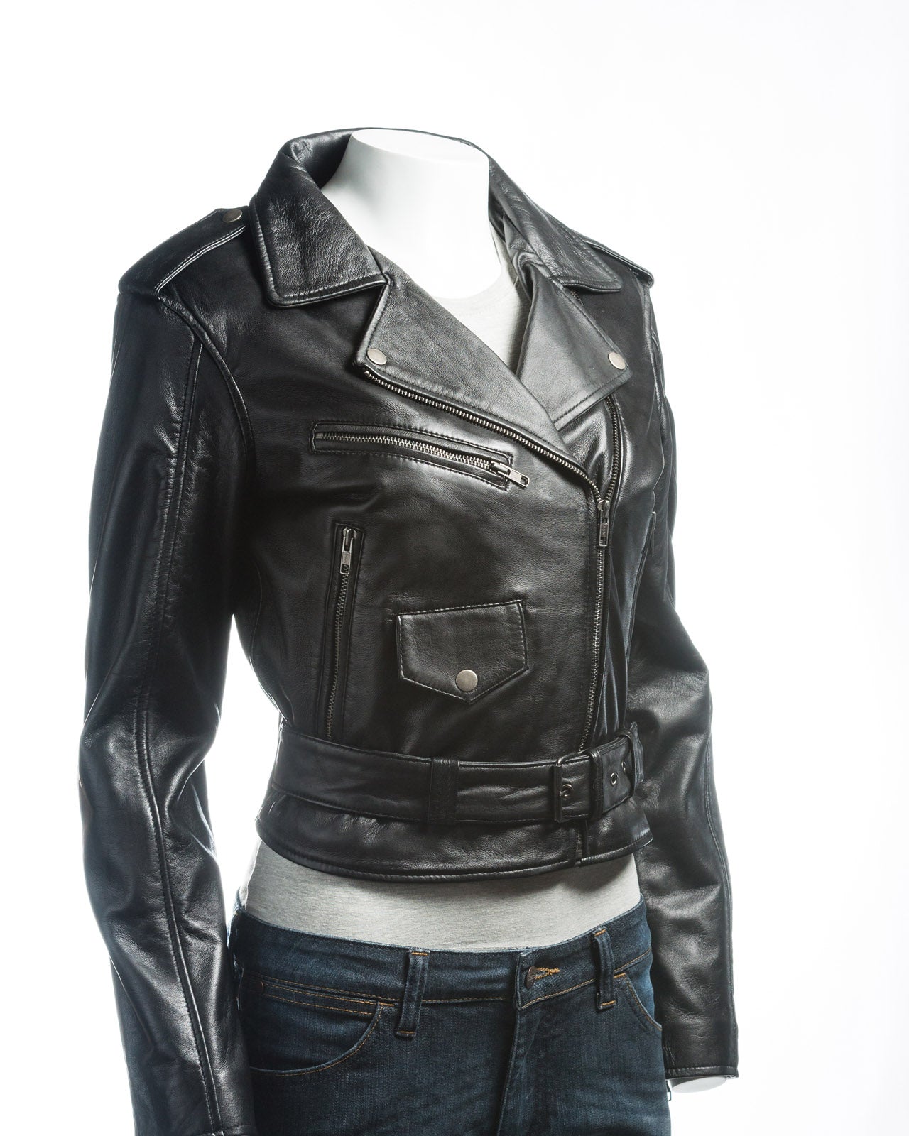 A stylish and feminine version of the classic brando style jacket. This version features the classic revere style collar with stud fasteners to keep it firmly in place, the assymetric zip, zipped pockets at the waist and chest and the buckled belt at the waist. A stud fastening small flapped pocket at the front matches the stud fastening epaulets at the shoulder. A fashion must-have for an edgy but ladylike look. This is a slim fit jacket. |