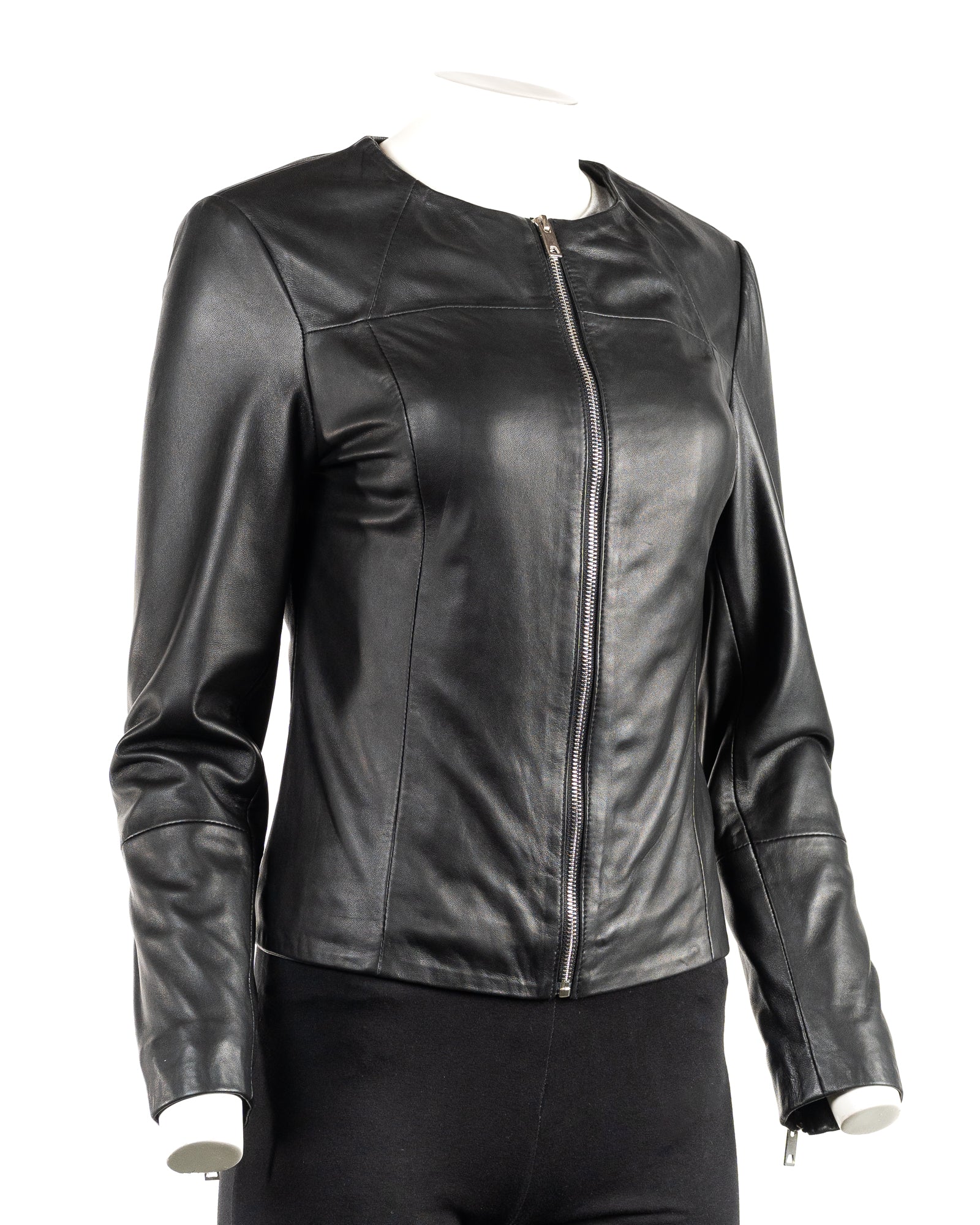 This is a beautifully sleek short zipped jacket, crafted from the finest soft sheep napa. The central zip leads up to a round neck collarless design and there are two zipped pockets at the waist; the cut is moderately fitted, and sits just below the waist. A perfect subtle design with options to dress up with any accessory.