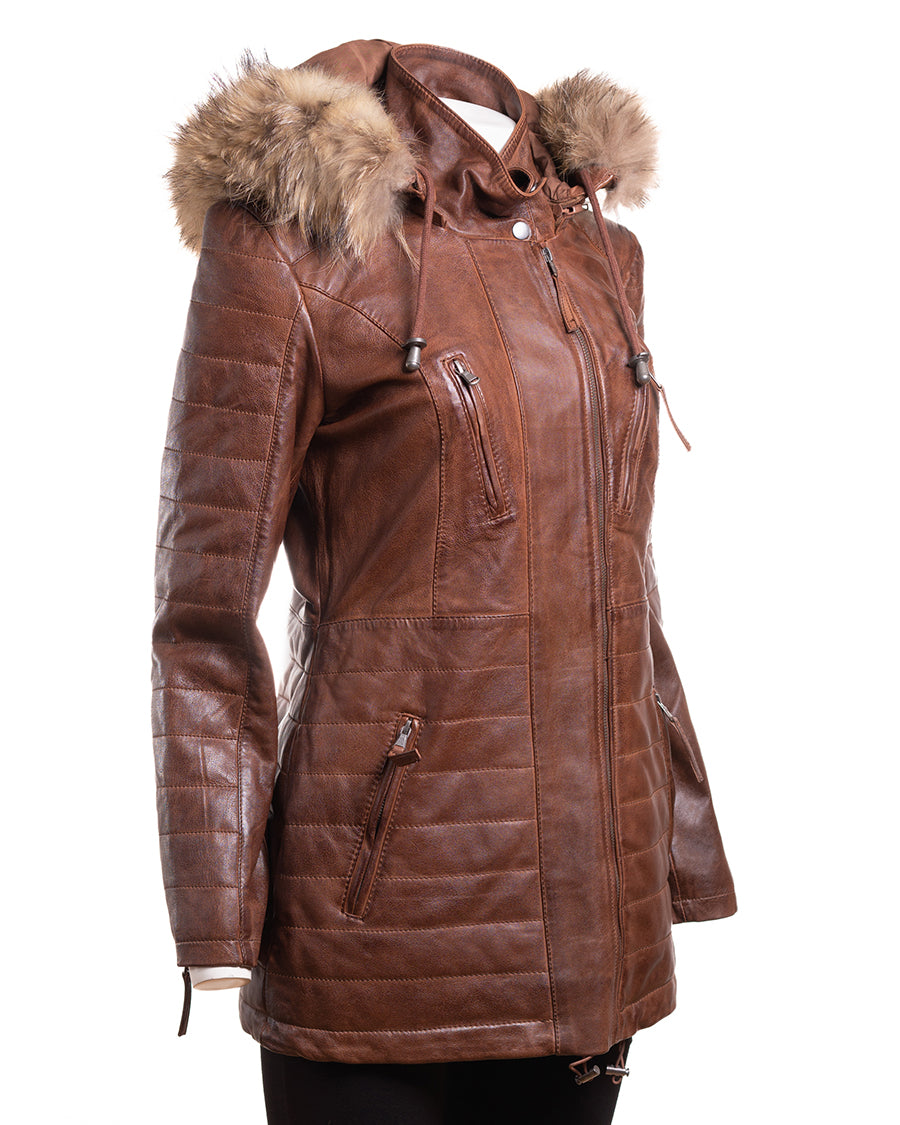 This is a lovely fitted parka crafted from subtle sheep napa. The beautiful horizontally quilted panelling on the arms and lower body perfectly enhances the feminine shape of this lovely jacket. Zipped all the way up with a slightly asymmetric front this jacket will keep you warm in the autumn/winter months. A detachable fur trimmed hood is the perfect accessory for those chillier days. Featuring zipped pockets at the chest and slanted at the hip, you will find this charmer is also rather practical.