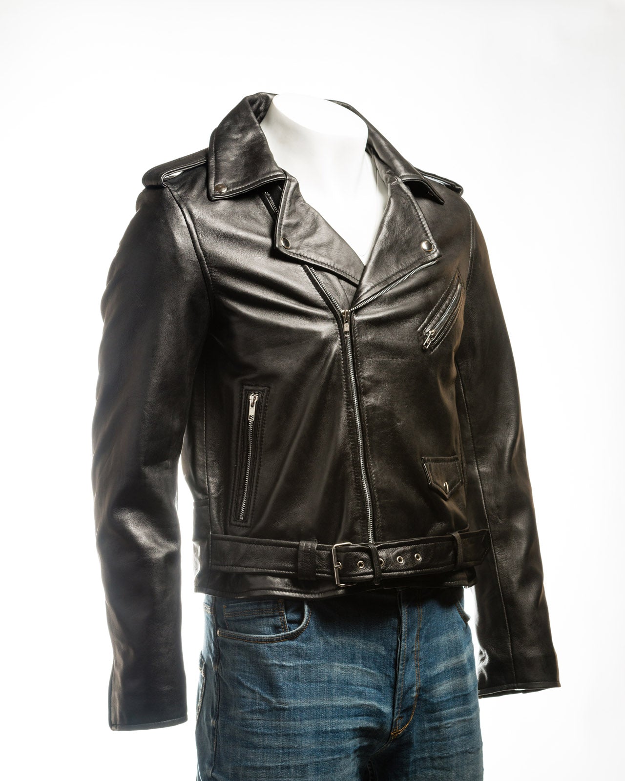| A wonderfully soft version of the iconic style championed by Marlon Brando, crafted from supple sheep napa. The sturdy YKK zip closes the assymetric double breasted front, rising to a wide press stud collar. There are two angled zipped pockets at the waist, a further diagonal zipped pocket at the chest, and a small pocket flap detail with press stud to the front centre. Studded epaulets enhance the silhouette of this classic design, whilst the buckled belt at the waist finishes it perfectly. The interior is beautifully lined with a further two pockets, one of which is zipped for extra security. |