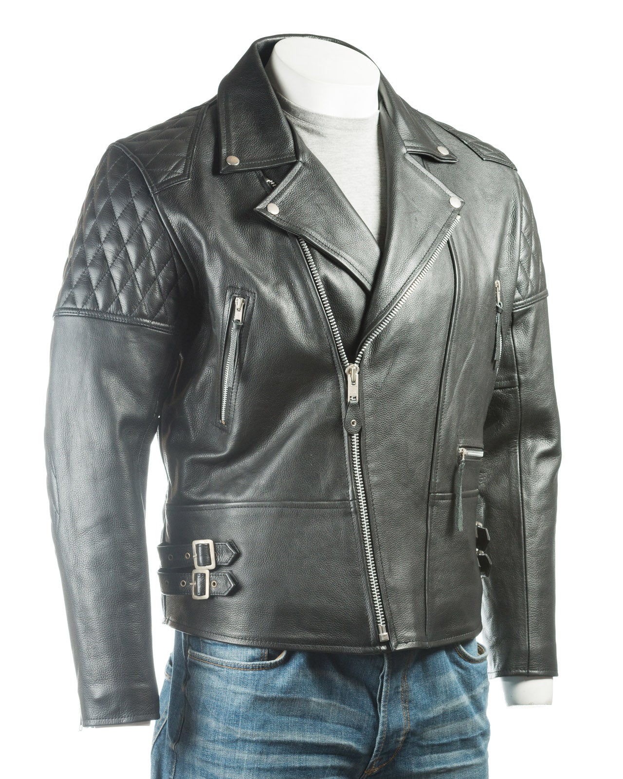 | This tough biker jacket is fashioned from a durable and thick cow hide, that offers extra protection above and beyond the sheep nappa versions. Featuring extra stitched padding at the shoulders and elbows and the classic brando style assymetric zip and stud fastening collar, this rugged number is as protective as it is stylish. Three zipped pockets at the jacket front and a further two inside provide extra security. The jacket sits comfortably at the waist, where you will also find double buckle adjusters to perfectly find your unique fit. |