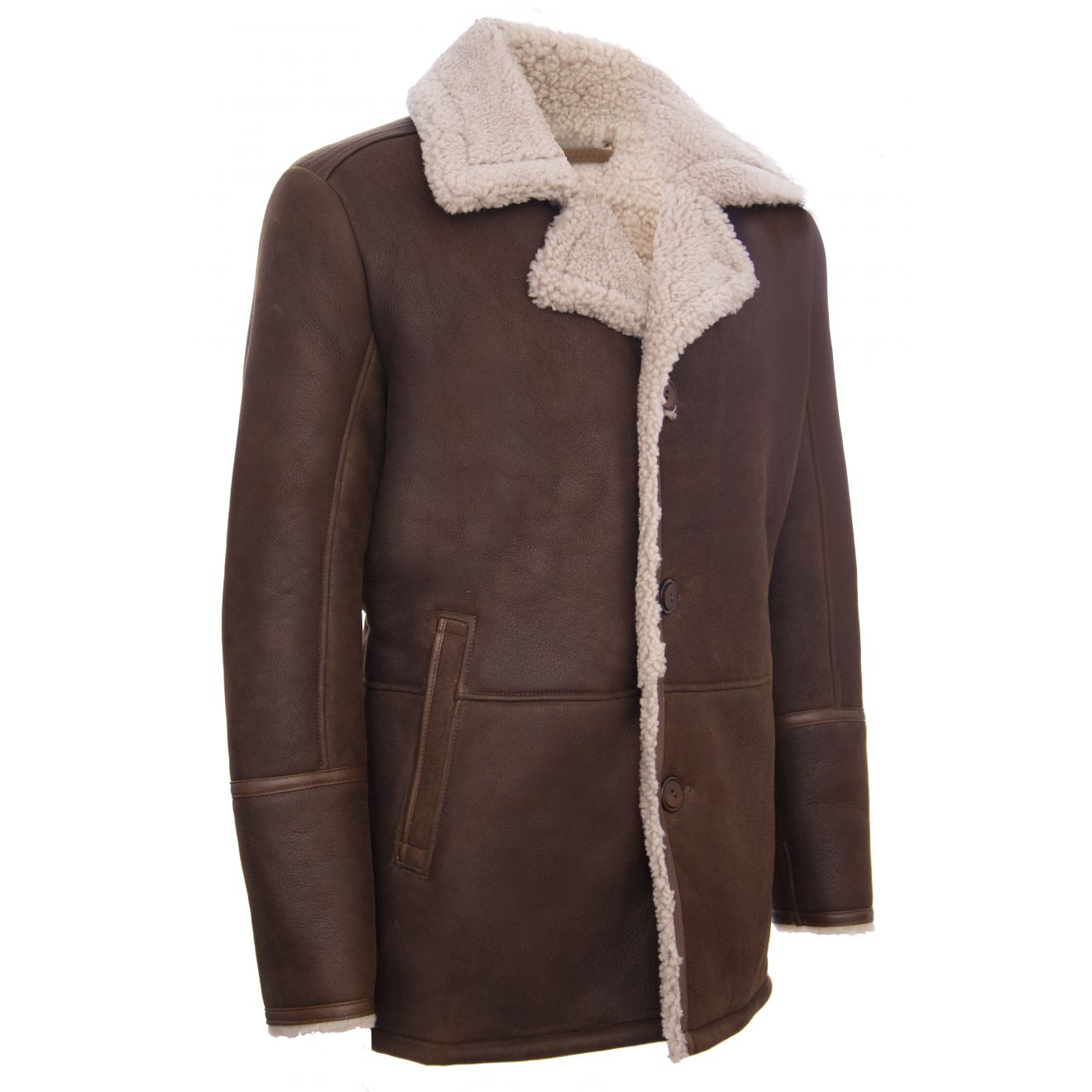 A classical pea coat sheepskin that is perfect for the colder days. This gentleman's single breasted coat does up with three buttons and notched lapels at the top so it can be done up fully to the neck. It has slanted pockets at the waist to keep your hands toasty, a lovely tailored fit and cuffs that can be turned up for any arm length. Because of the dark tan colour - this coat ages wonderfully which is one of the charms with any leather or sheepskin garment.