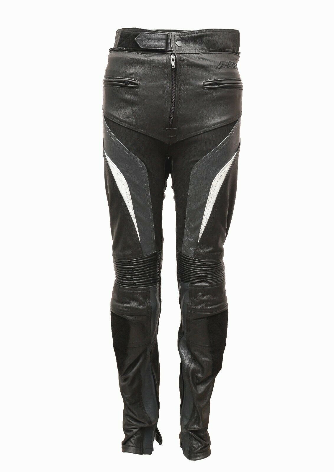 These smart cowhide leather trousers match our leather armoured biking jacket. They have removable CE armour at the hips and knees, a removable shin slider with compartments for knees sliders also. There's an 11 inch ankle zip, elasticated crotch and stretch panels at the knee for comfort.