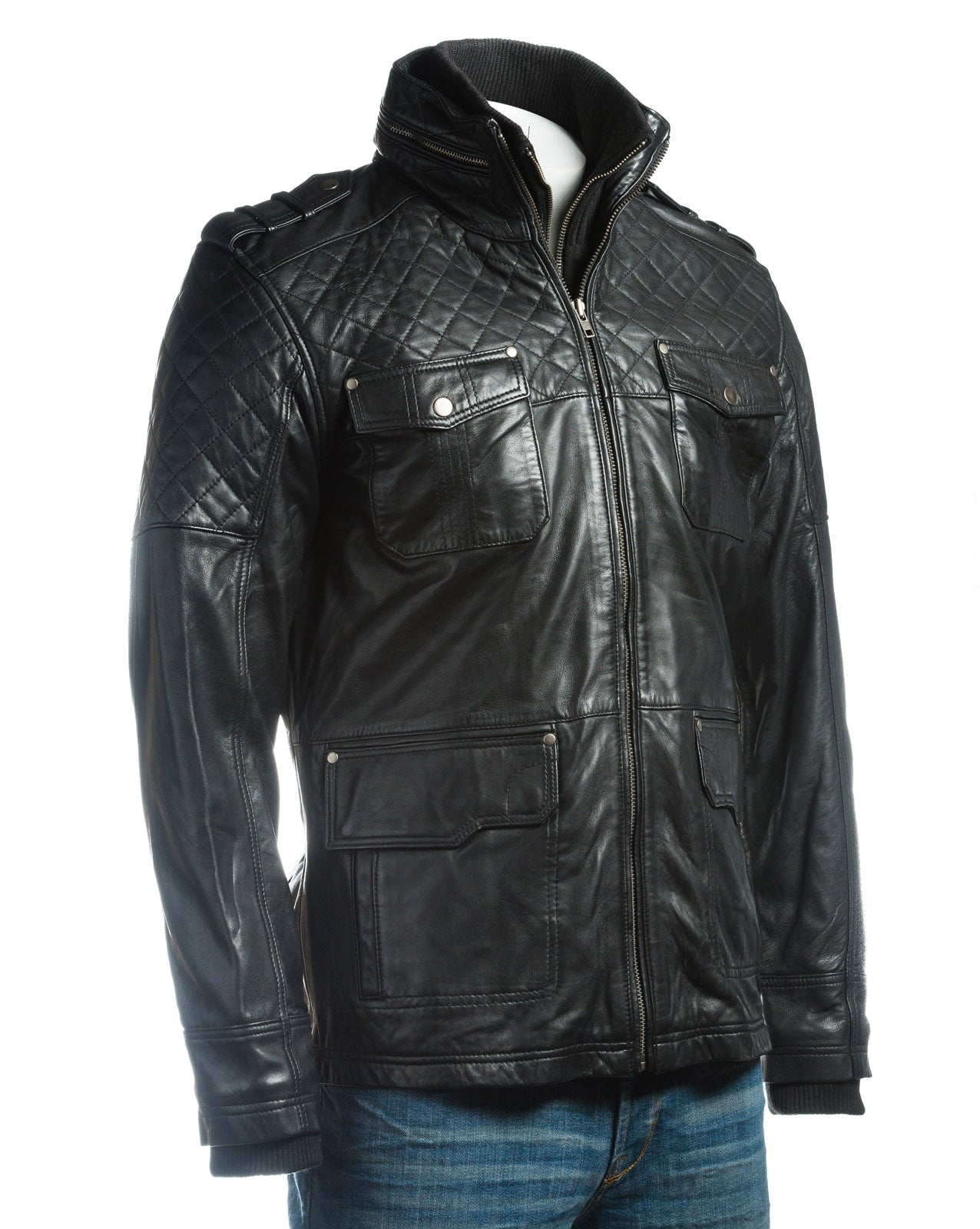 | A super multifunctional jacket with quilt stitch detailing. Crafted from the highest grade sheep aniline nappa this jacket features a rugged, exposed YKK zip front rising to a high funnel neck collar that features a zipped design feature around the circumference. Diamond quilted stitch detailing extends down over the front and back yoke and upper sleeves. There are four patch pockets with press stud fasteners on the body. The waist level pockets also have side entry, hand warmer compartments. On the inside the jacket is fully lined in satin with an additional two leather trimmed pockets, one of which is zipped. On colders days, insert the removable, rib knit collar and zip frontage for super wind-shill resistance. This jacket is a classic marriage of style and practicality. |