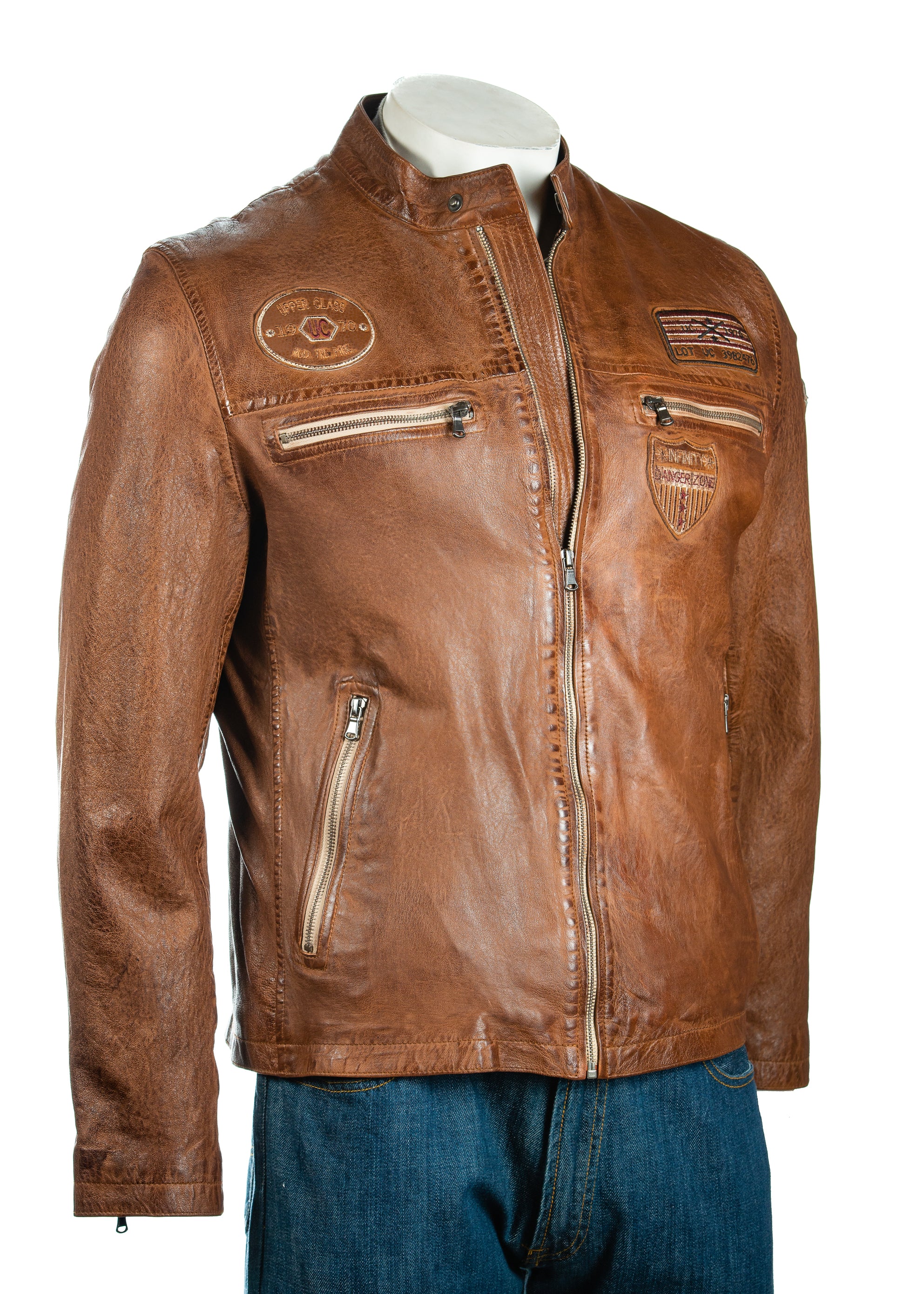 This is a durable, yet soft, sheep nappa slim fit racer style jacket, featuring contrasting patchwork and stripe detail and a durable YKK zips throughout. The central zip rises to a stand up collar, from where stripe detail extends, across the shoulders and down the sleeves. Cuff width be adjusted with zips, there is also further adjustable stud fasteners at the waist. To the front you will find four pockets, the top two of which are zip fastened, and further patchwork detail. The inside is fully lined and features two secure pockets, one with a zip fastener. Available in tan and black, this is a stylish, casual and affordable classic.