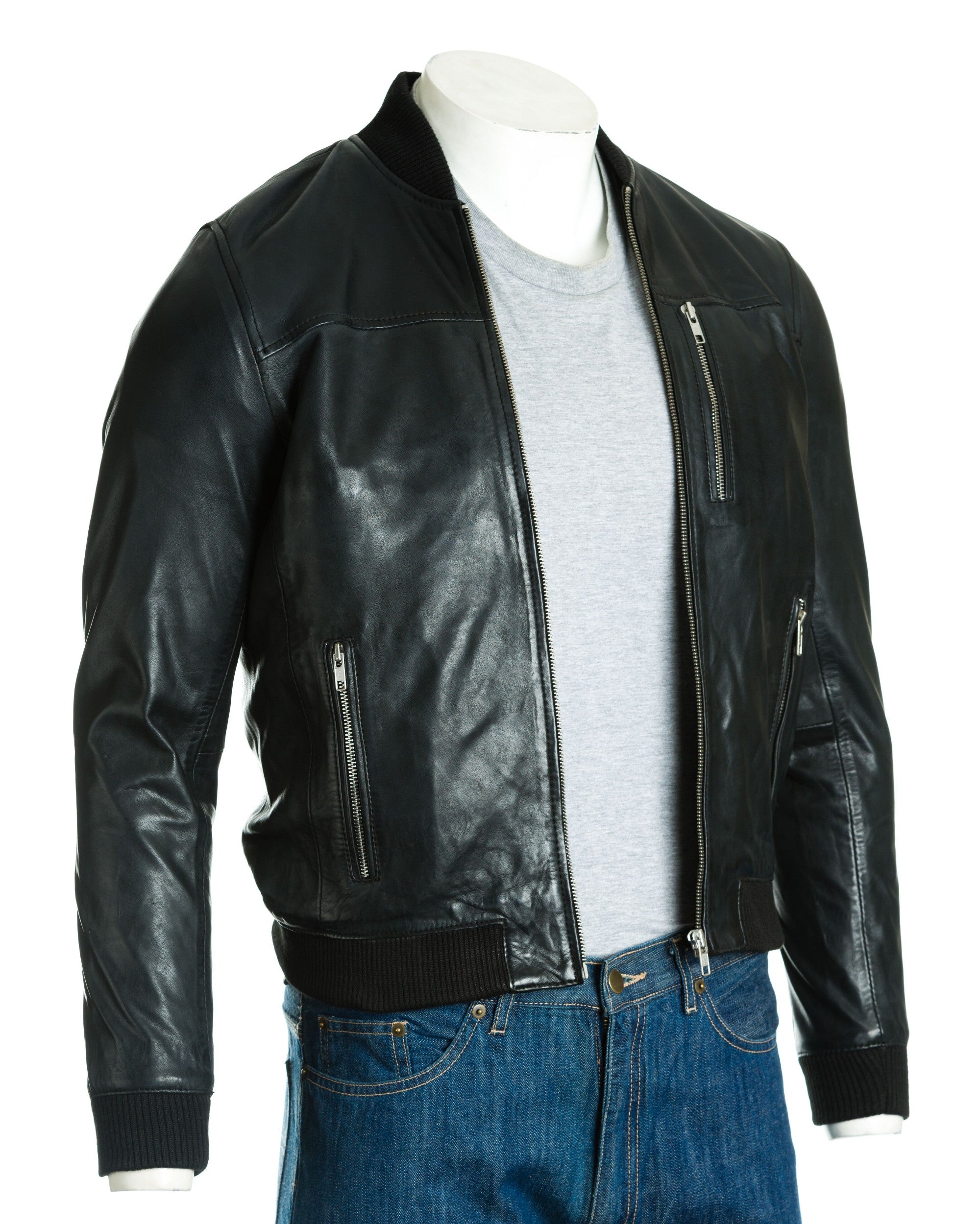 This classic look leather bomber is a jacket that can be worn for all occasions. It's crafted from sheep nappa leather with a central YKK zip that does up to a short rib-knit collar. There's also rib-knit cuffs and hem for a smart fitted look. The jacket has three zipped pockets on the front and another leather trimmed buttoned pocket inside where you'll find the jacket is fully lined.