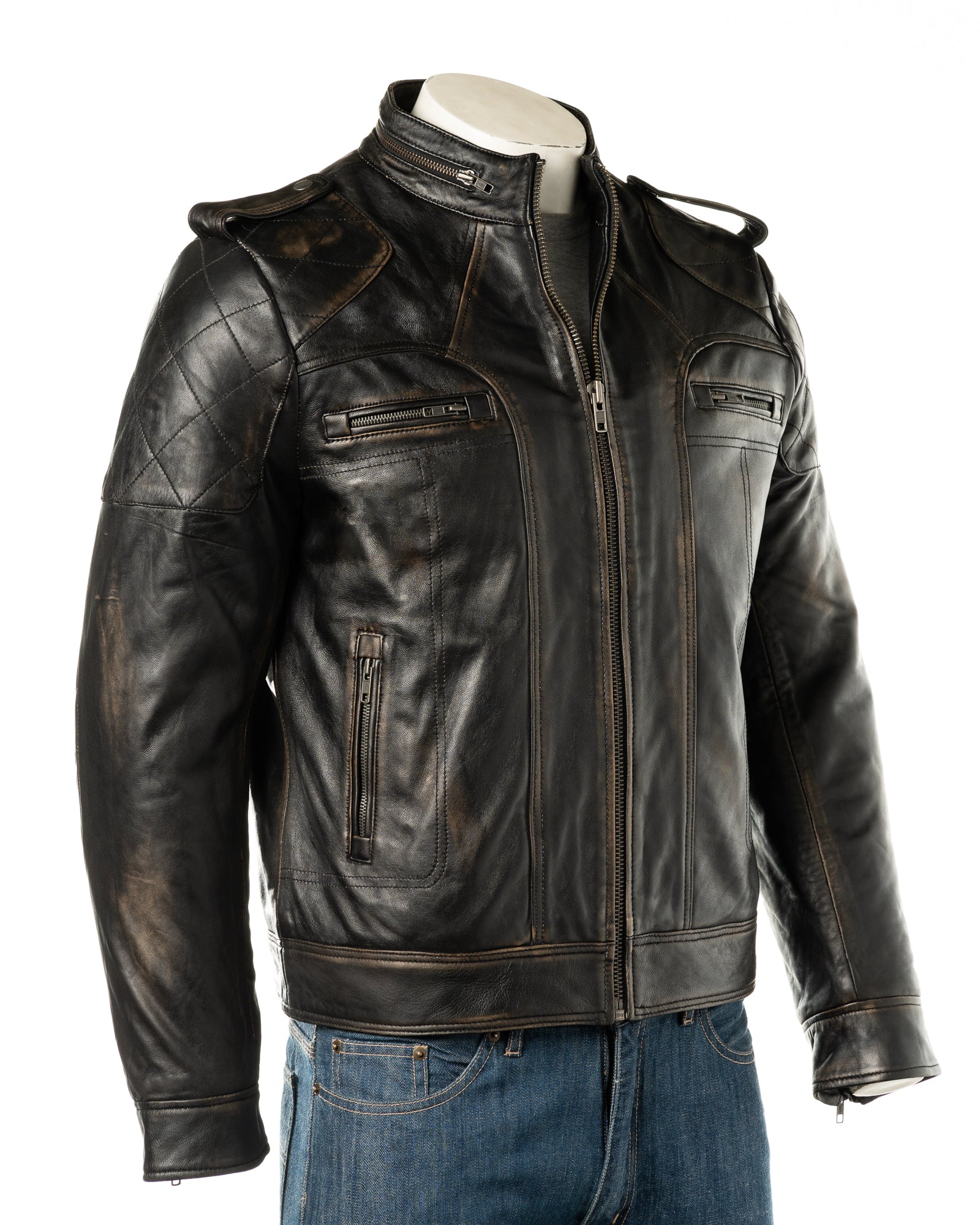 This racer style leather jacket is beautifully crafted from soft and supple Sheep nappa leather. A strong central metal zip on the front does up to a stand up collar, there are epilettes on the shoulder and diamond paneling across the shoulders and upper arms. Secure your possessions in the two zipped hand pockets either side and in the two more on the chest. There are also two pockets inside this fully lined leather jacket - one zipped to secure your possessions. A joy to wear in all seasons.