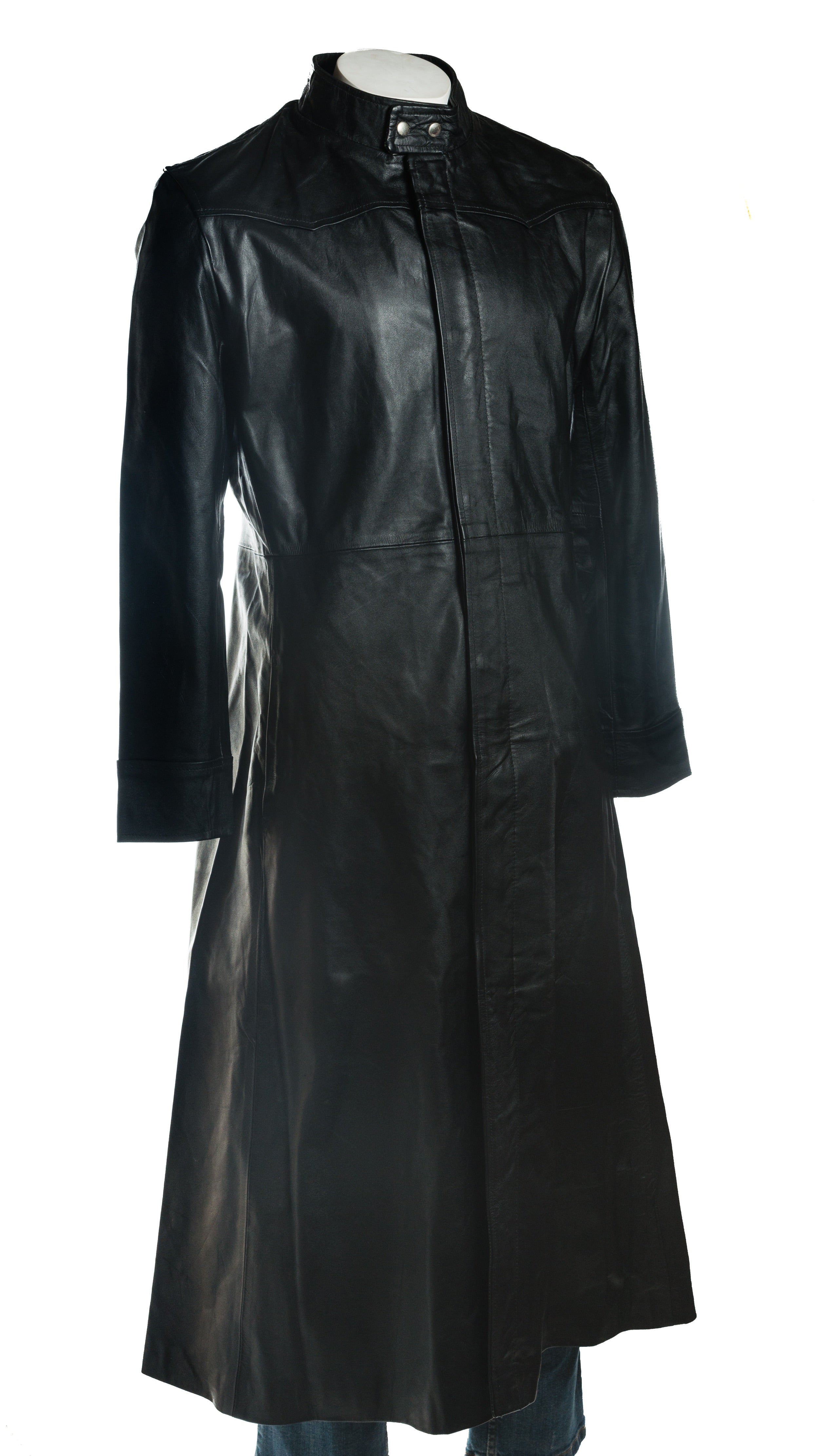 Step into the matrix with this iconic full length duster coat. The central closure is secured with press stud fasteners and covered with a flap, rising to a small standup collar that also fastens with press studs. Hand warmer pockets are concealed at he hips, adding to the sleek and simple eleagant lines of the cut of this beautifully handsome piece.