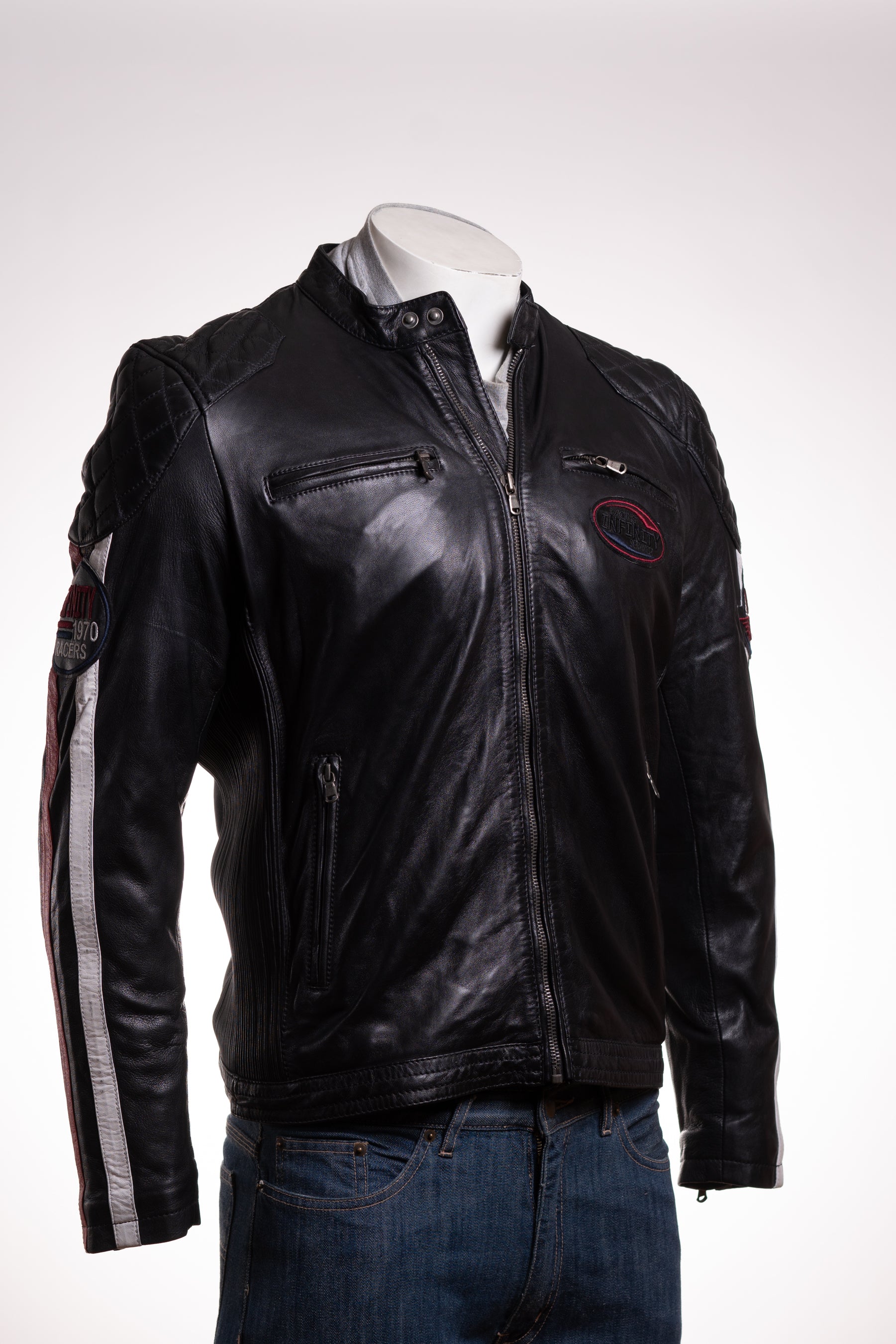 This is a sturdy yet soft sheep nappa slim fit racer style jacket, featuring diamond quilting badges and stripes with a durable YKK zip fastening. The central zip rises to a stand up collar. Cuff width and waist can be adjusted with zips. To the front you will find four pockets, the top two of which are zip fastened, and further patchwork detail. The inside is fully lined and features two secure stud fastening pockets. Available in desert tan and black, this is a stylish, casual and affordable classic.