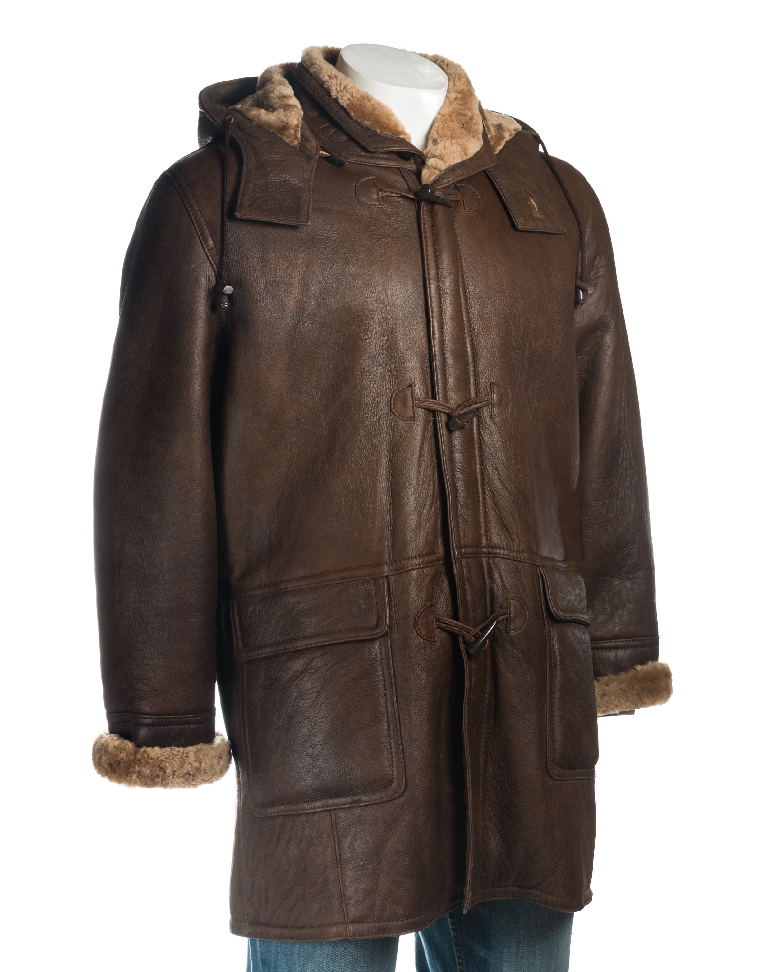 A warm a stylish winter essential. This beautiful duffle style coat is made from a soft sheepskin with a leather finish. Featuring a central fastening, flap covered zip, and the iconic duffle toggles, there is also a detachable hood with drawstring, excellent for keeping the cold at bay. The pockets are deep and flap covered also.