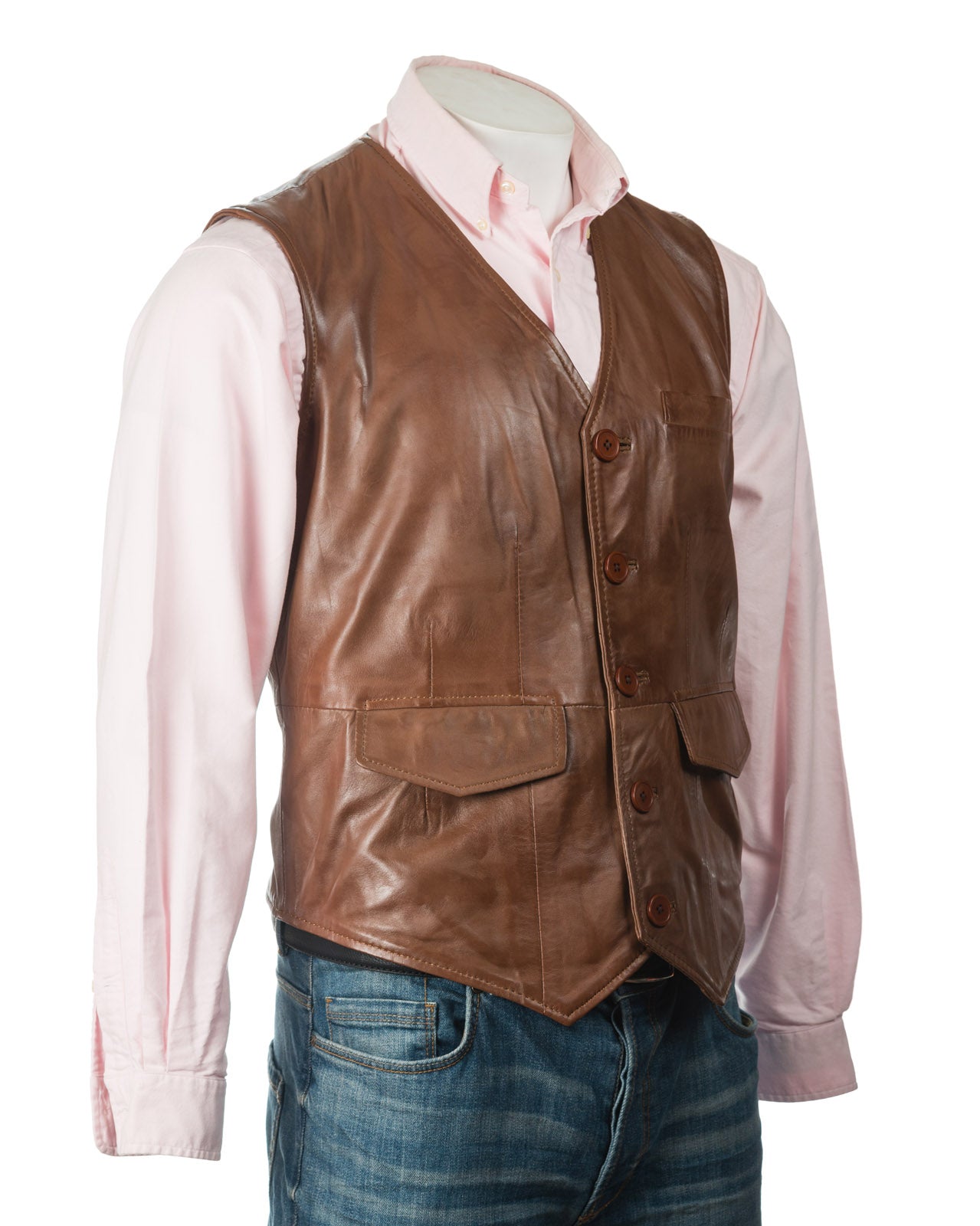 This is an expertly tailored and practical full leather, button up waistcoat, crafted from the softest sheep nappa. At the chest you will find a small semi-concealed pocket and two flap covered pockets at the waist. To the rear there is a buckle tab adjuster for a perfect tailor made fit.