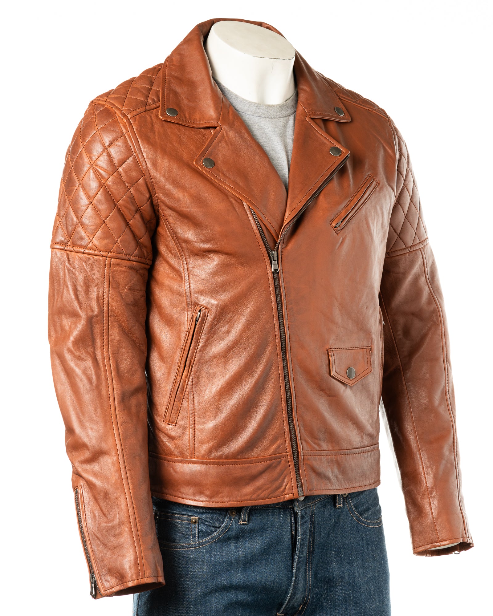 | This is a modern and stylish variation of the classic asymmetric zipped biker jacket, crafted from a super soft and supple sheep nappa. The jacket features zip adjusters at the waist. Additionally, the double breasted front features a sturdy zip that leads to a notched collar that can be worn up and fastened with press studs, exposing the subtle diamond stitch detailing at the epaulets and upper arm. There are three zipped pockets on the body, zip adjusters can also be found at the cuffs. |