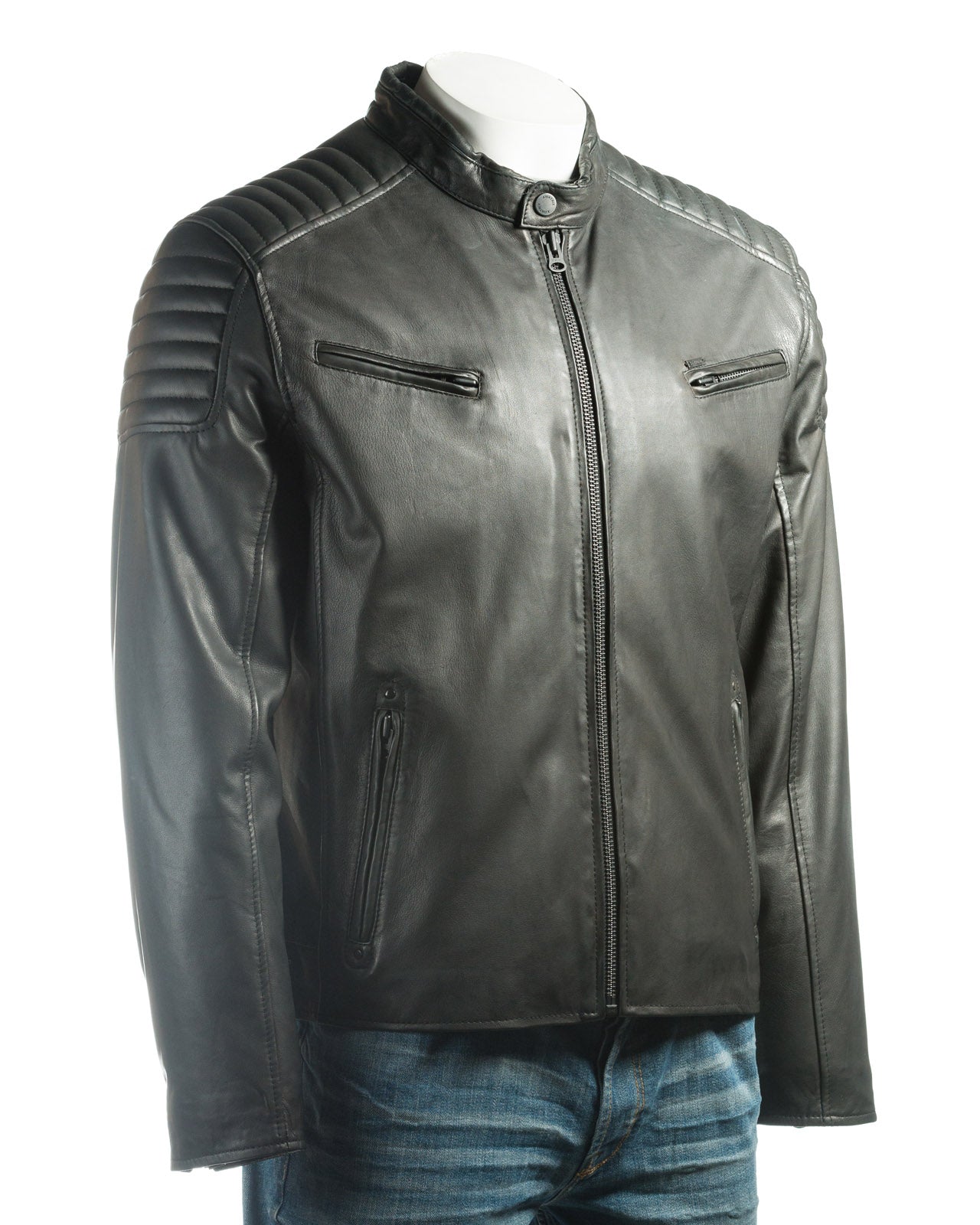 A slim-fit soft matte finish vegan leather racer style jacket, featuring quilt detail at shoulders. This is the exact design as our Original jacket Emilio just made from vegan/faux leather. There are two zip fastening pockets on the chest and two at the hip. The cuffs are zip adjustable, you will also find buckle and loop adjusters at the waist. A further two pockets can be found on the fully lined interior. The central zip rises to a quilted, stud fastening collar. A stylish and timeless piece for any wardrobe, with or without the bike.
