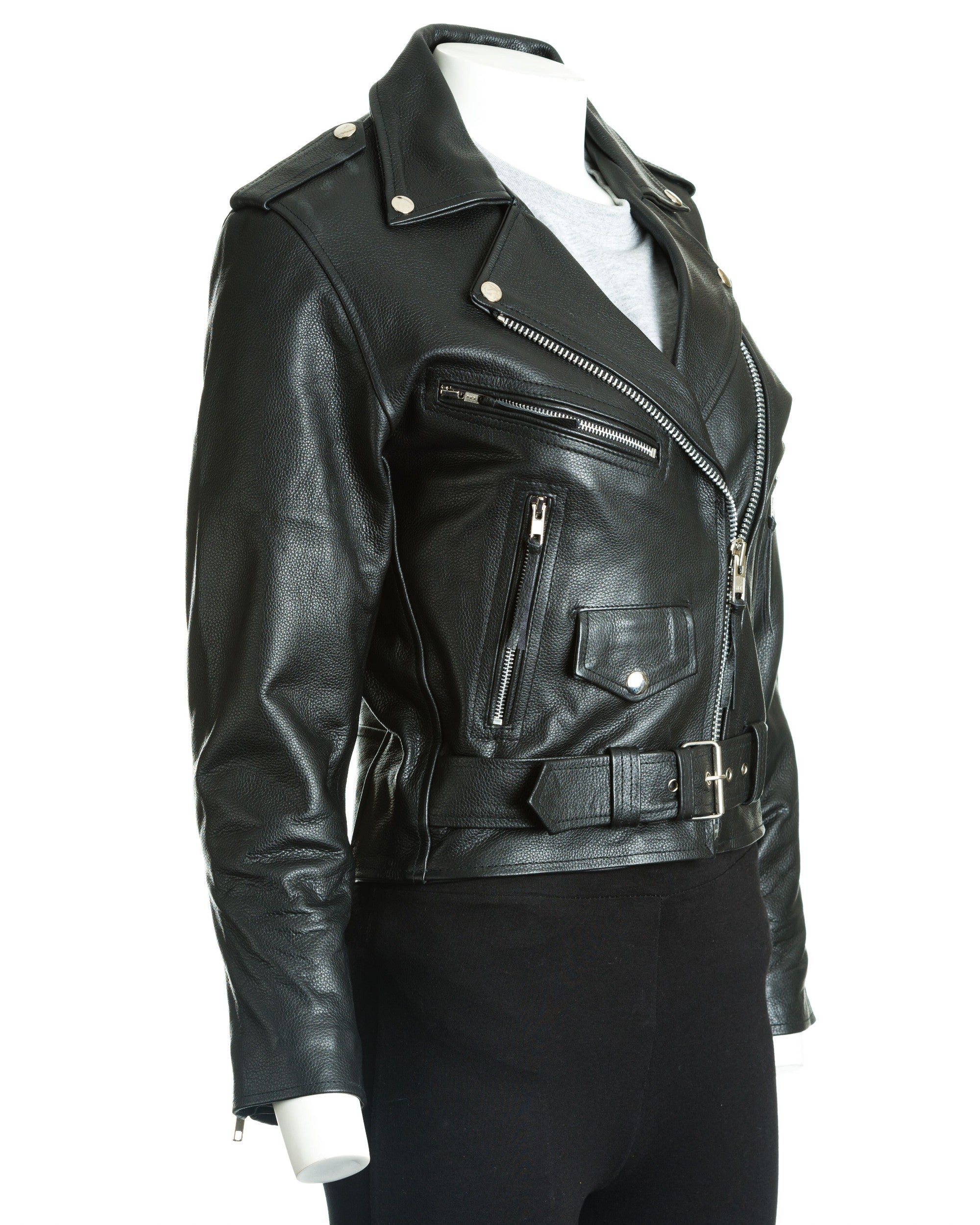A stylish feminine version of the brando style biker jacket. This jacket maintains all the features of the classic style but with an electric twist. It looks stunning in black and really stands out in white or purple. The jacket has a YKK zip angled over a double breasted front leading to a collar that can be held in place with a press stud. It has three zipped side pockets, small stud fastened front pocket and buckled belt at the waist. Inside the jacket is fully lined with a quilted satin where you will find another pocket.