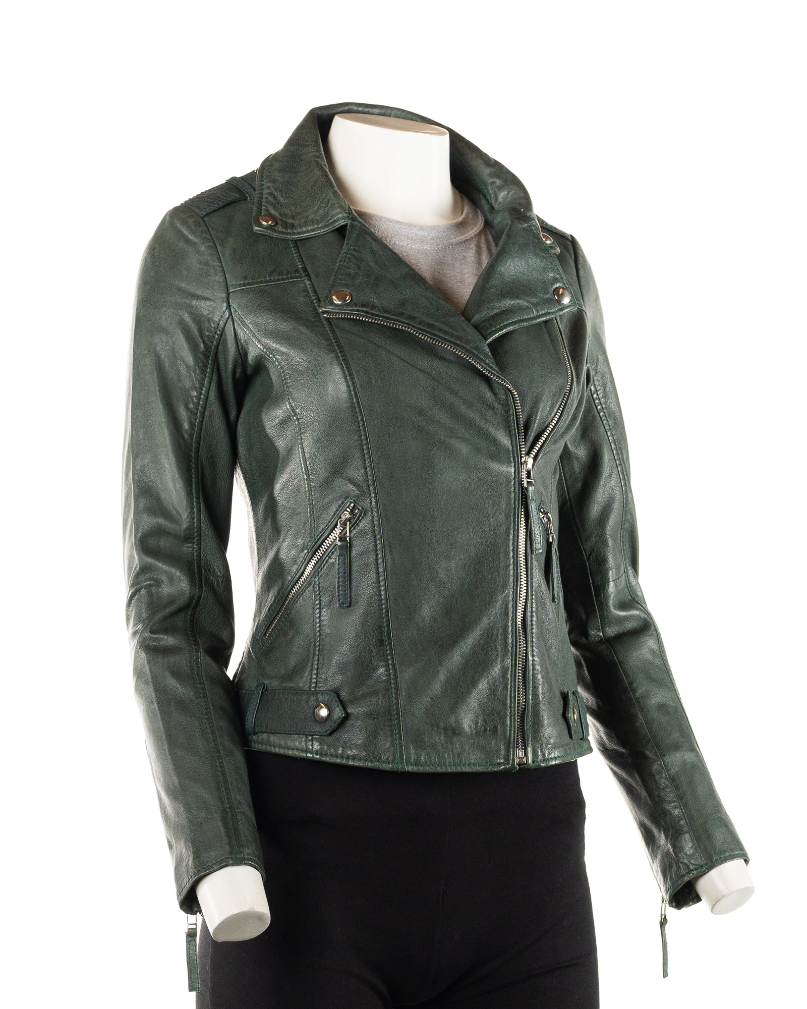 This stylish women's biker jacket is crafted from extremely supple sheep nappa leather, making it adhere perfectly and naturally to your body shape. It has a classic biker angled front zip on a double breasted front with three pockets which can be zipped shut, two at the waist and one on the chest. There are zips on the wrists also and inside the jacket is fully lined. This jacket would look great with many outfits.