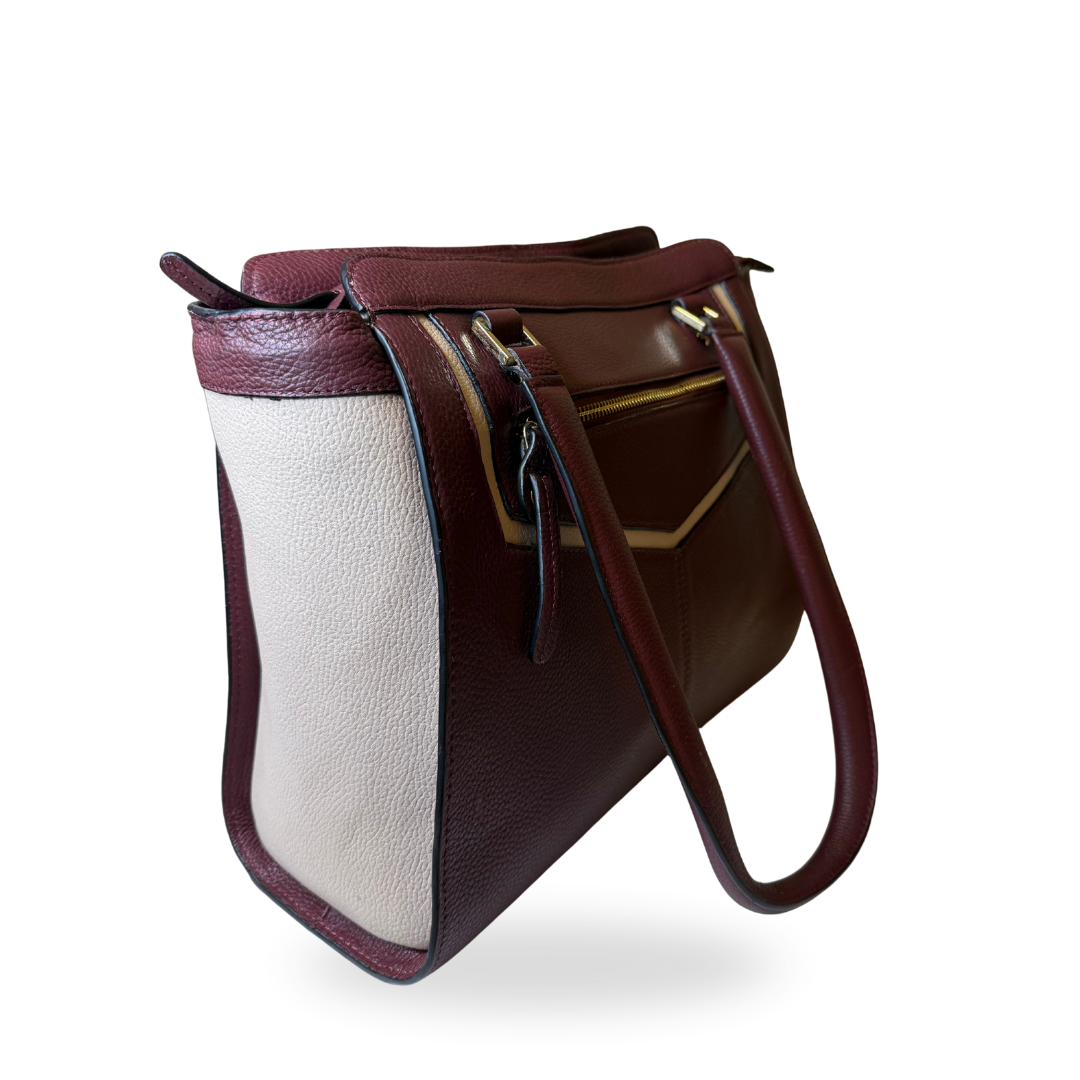 Charm Exclusive Women's Leather Shoulder Bag, a perfect blend of style and functionality. Crafted from soft, genuine leather in an elegant burgundy and white accents, this bag features a spacious interior with a dedicated laptop compartment and multiple pockets for organising daily essentials.