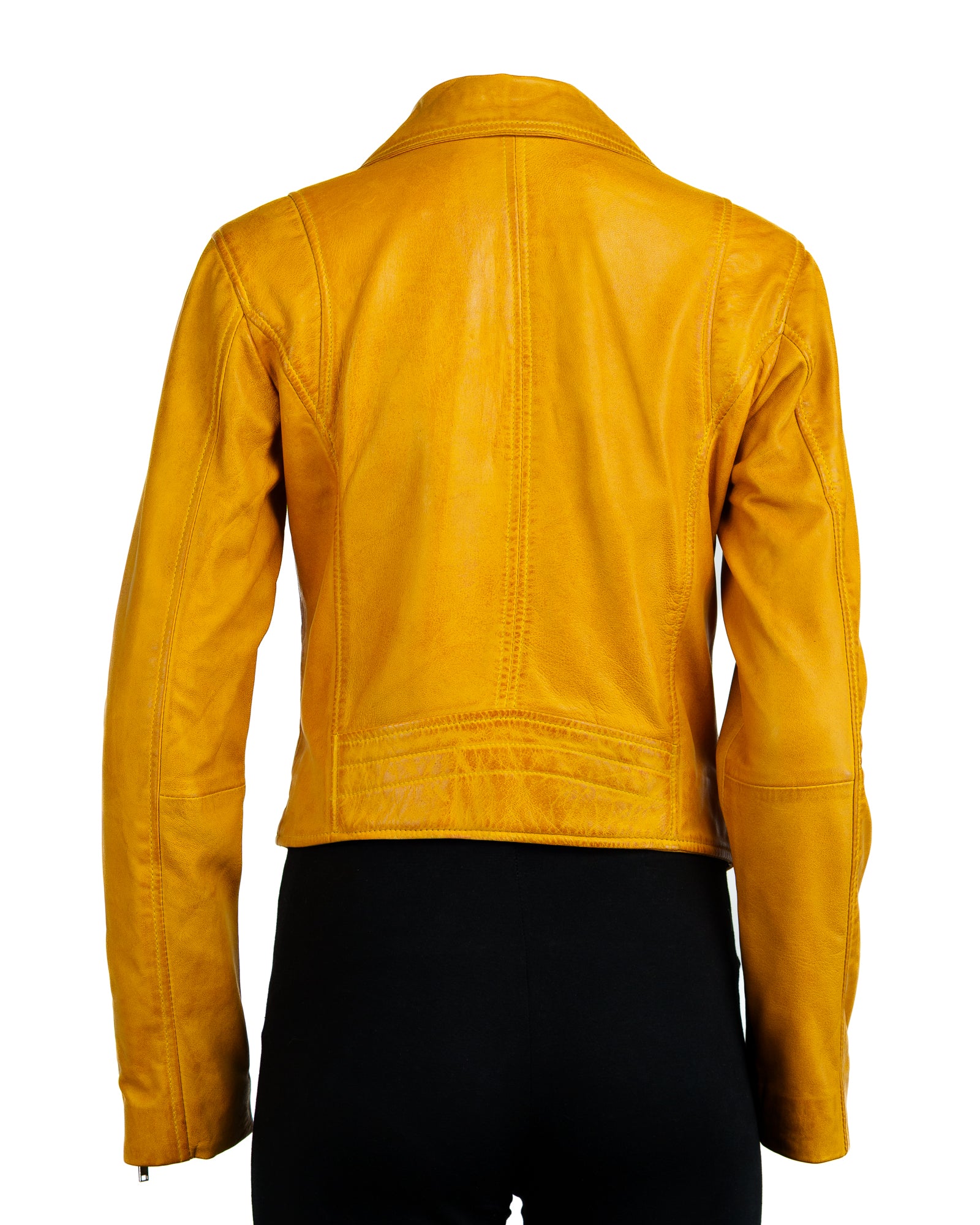 This stylish women's biker jacket is crafted from extremely supple sheep nappa leather, making it adhere perfectly and naturally to your body shape. It has a classic biker angled front zip on a double breasted front with three pockets which can be zipped shut, two at the waist and one on the chest. There are zips on the wrists also and inside the jacket is fully lined. This jacket would look great with many outfits.